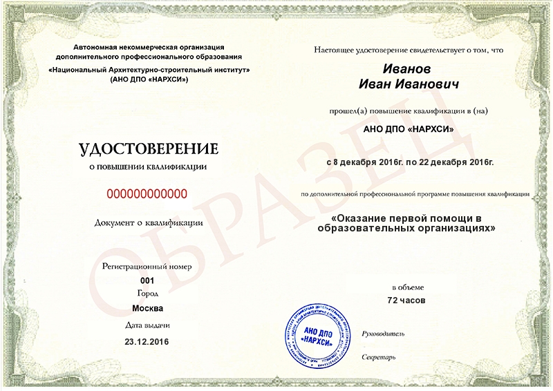 Повышение квалификации Оказание первой помощи в образовательных организациях (72ч)