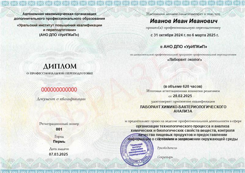 Учебный план программы профессиональной переподготовки «Лаборант-эколог» с присвоением квалификации «Лаборант химико-бактериологического анализа»