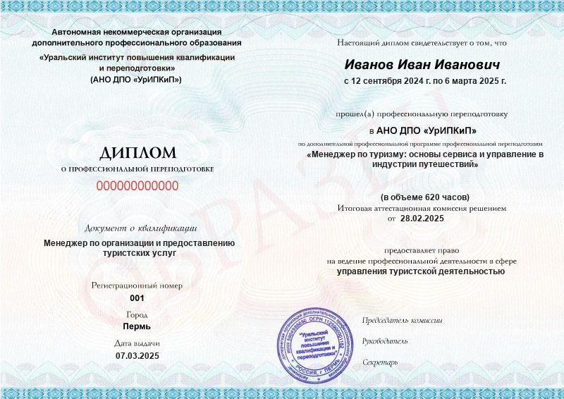 - Квалификация: Менеджер по организации и предоставлению туристских услуг