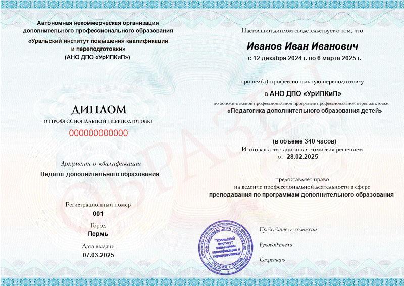Да, дипломы и удостоверения оформляются в соответствии с действующим законодательством РФ. Документы печатаются на специальных бланках, заверяются печатью АНО ДПО «УрИПКиП».