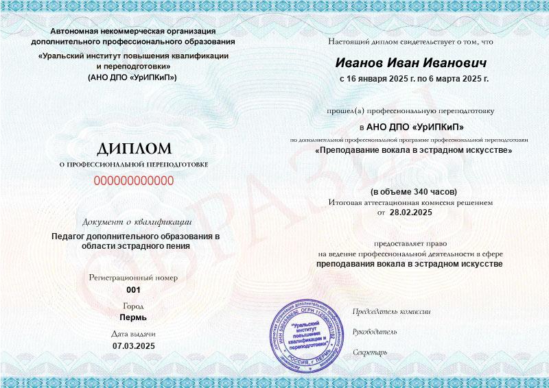 Пройдя профессиональную переподготовку, вы сможете успешно работать педагогом по эстрадному вокалу в музыкальных школах, театральных студиях, центрах творчества, домах культуры. Применение современных методик обучения певческому искусству поможет вам достичь высоких педагогических результатов, а вашим воспитанникам показать хороший уровень исполнительского мастерства.