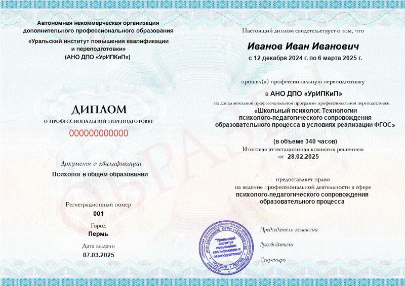 • Квалификация: Психолог в общем образовании